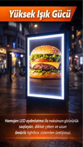 İç ve dış mekan kullanıma uygun, LED aydınlatmalı lightbox sistemleri üretiyoruz. Markanızı ön plana çıkaran modern ve dikkat çekici çözümler sunuyoruz.